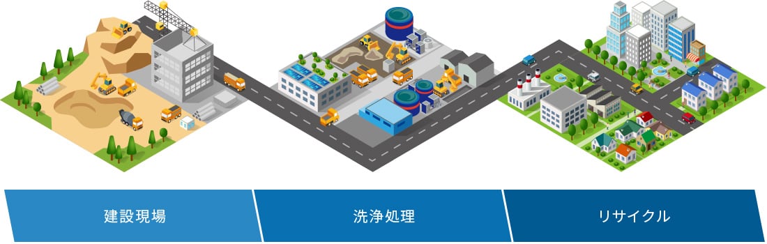鉄道や道路などの工事が行われる土木現場、高層ビルや商業施設などの施工が行われる建設現場。それぞれの工事現場からは輩出される廃棄物や汚泥には、様々な種類があります。その中でサンコーリサイクルが扱っているのが、「汚染土壌」「建設汚泥」「汚染汚泥」の処理です。工事現場から、それら汚染土壌や汚泥を自社プラントに運搬し、自社プラントにて洗浄し、最終処分やリサイクルへとつなげる。サンコーリサイクルの仕事は、こうしたリサイクル事業を通じて、よりよい環境づくりに貢献する環境ビジネスを展開しています。